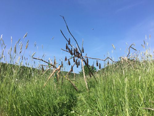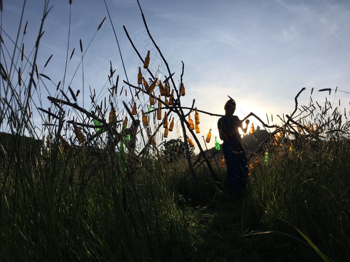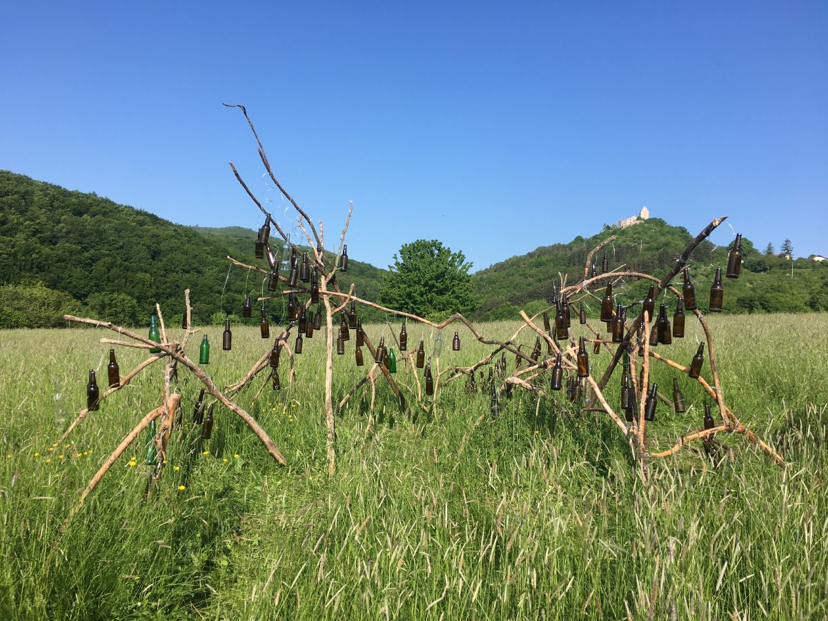 A bottle organ in a meadow sounds when the wind comes. Supported by