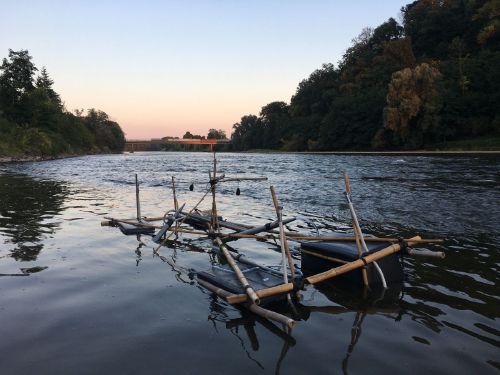 First attempts to collaborate with the river Mur resulted in sinking rafts which play quiet aleatoric music as they push wind through organ pipes. Since the pipes have a nuanced acoustic response to changes in air pressure and flow, and transition between open-ended pipes (above water) to detuned close pipes (within water), a sort of physical programming happens when their arrangement on the raft is adjusted.